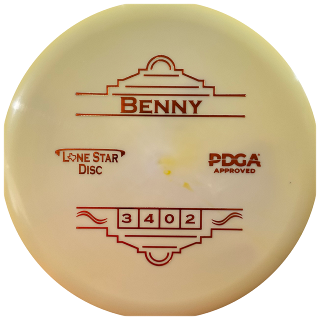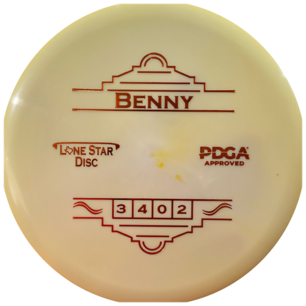 The Lone Star Disc Benny is a straight-to-stable putter with a bead that perfectly complements the Penny Putter. It offers a dependable and straight flight path with a predictable fade, making it a great throwing putter.