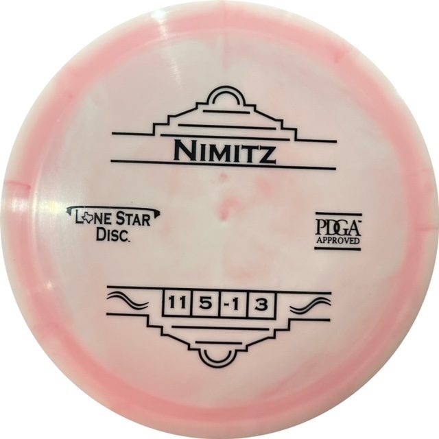 Named after the Fredericksburg native Chester Nimitz, the Nimitz is a disc that fits perfectly between the Curl and Warbird. This Distance Driver has controllable turn with reliable fade at the end of it’s flight.