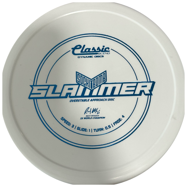 The Sockibomb Slammer is an all new mold based on the grip of the original Dynamic Discs Slammer and the consistency Ricky Wysocki loves in the Westside Discs Harp. The dependability of the Sockibomb Slammer is a must have for players of all skill levels and arm speeds. It is a super overstable throwing putter that can be thrown both backhand and forehand with a predictable finish every time, even into a strong headwind. It was created in collaboration with 2x World Champion Ricky Wysocki and is here to improve your approach game.
