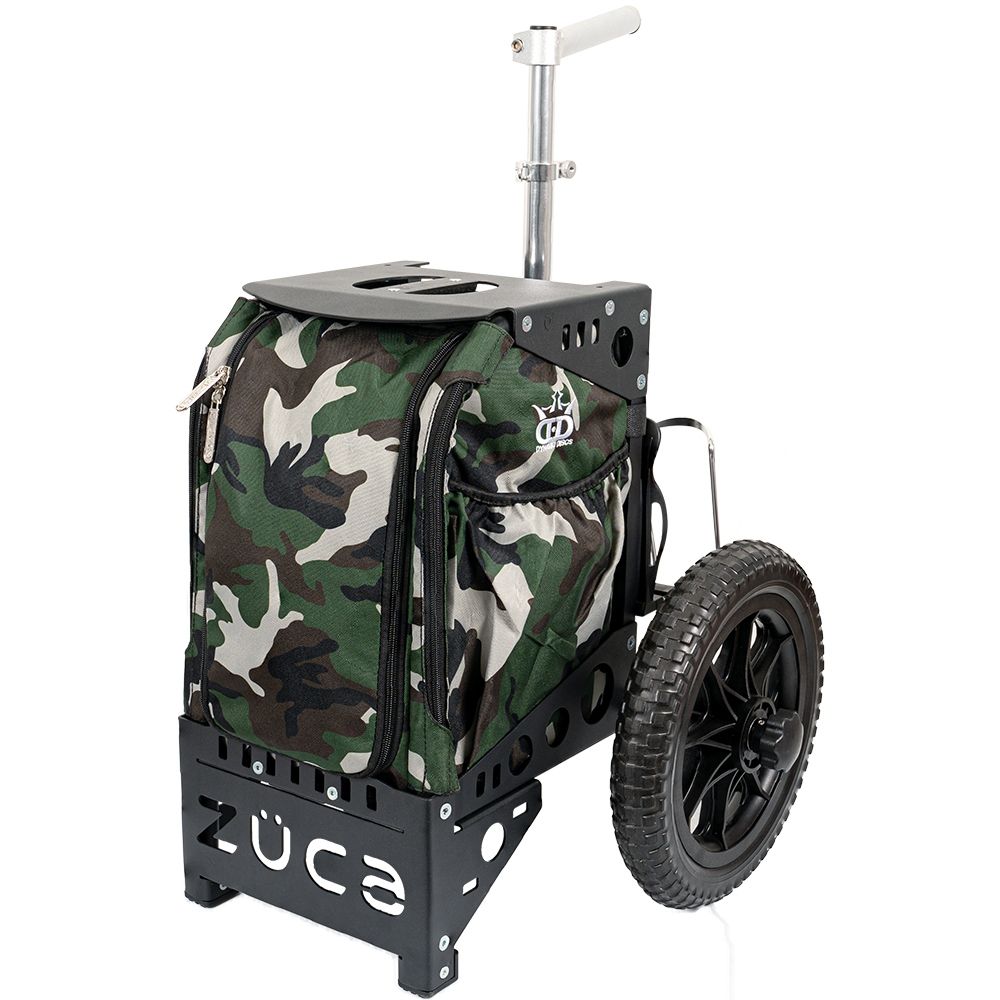Dynamic Discs Compact Cart by ZÜCAFor disc golfers who carry a smaller set of discs, ZUCA’s newest cart is a more compact carrier, offering the same telescoping handle, removable tubeless tires, and rugged performance characteristics of the All-Terrain Disc Golf Cart. The patented ZUCA frame holds up to 300 lbs, offers a slightly lower seat, and breaks down to 20”H x 10” W x 11” D size with wheels and spacers and bottle cages removed and tucked into the unit (compared with the 24”H x 10”W x 13”D size of the All-Terrain Disc Golf Cart). Insert bag features include: