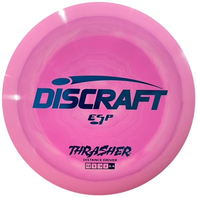 The Discraft ESP Thrasher is an understable maximum distance driver (0.4). This disc golf driver is very fast but not flippy. It responds like lightning to average arm speeds and is very forgiving of release problems. Slower arms can rip it, bigger arms can hyzer flip it without any ugly rollover! It will finish on a slow hyzer in most situations, so expect some gloriously clean anhyzers with a mild finish!