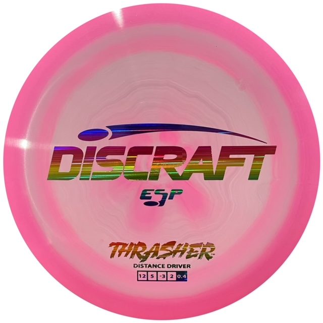 The Discraft ESP Thrasher is an understable maximum distance driver (0.4). This disc golf driver is very fast but not flippy. It responds like lightning to average arm speeds and is very forgiving of release problems. Slower arms can rip it, bigger arms can hyzer flip it without any ugly rollover! It will finish on a slow hyzer in most situations, so expect some gloriously clean anhyzers with a mild finish!