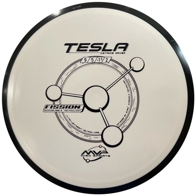 The MVP Fission Tesla is a stable-overstable distance driver. The Tesla’s responsive design balances a subtle turn and reliable fade, while a pronounced glide and forward finish gain extra distance. This disc golf driver extends high power or headwind lines and has plenty of bite to fade back reliably and reduce lateral drift. The Tesla can be considered the big brother to our acclaimed Volt fairway driver. Choose the Tesla for long-range pinpoint accuracy.
