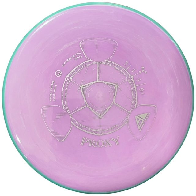 The Axiom Neutron Proxy is a straight-stable putt and approach disc. It shares the Envy mold’s core, lending the same low-profile feel and solid grip, along with a short wing width and wide flight plate diameter for superior glide. This disc golf putter sets itself apart from the Envy with a remarkably straight forward-fading finish. A bit of high-speed turn potential allows the Proxy’s lines to be manipulated over a broad range of power, and helps less powerful throwers achieve straight putter drives.