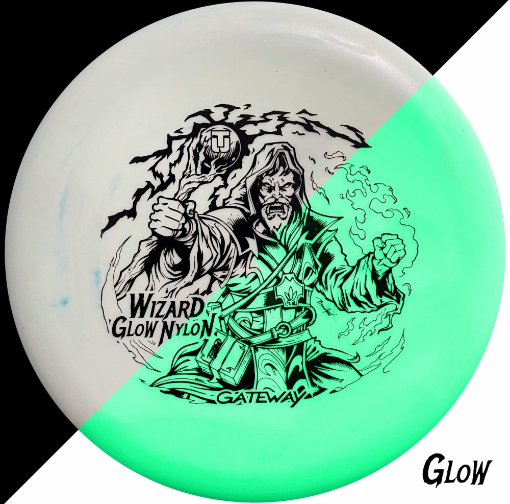 The Nylon Superglow Wizard is the first release of the Nylon plastic in Superglow. The stiffness falls between SS and SSS. This run seems to be a hair shallower and faster according to Gateway. The art is by Brian Allen of Flyland Designs 2021.