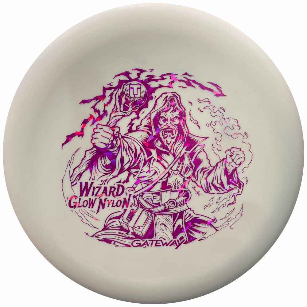 The Nylon Superglow Wizard is the first release of the Nylon plastic in Superglow. The stiffness falls between SS and SSS. This run seems to be a hair shallower and faster according to Gateway. The art is by Brian Allen of Flyland Designs 2021.