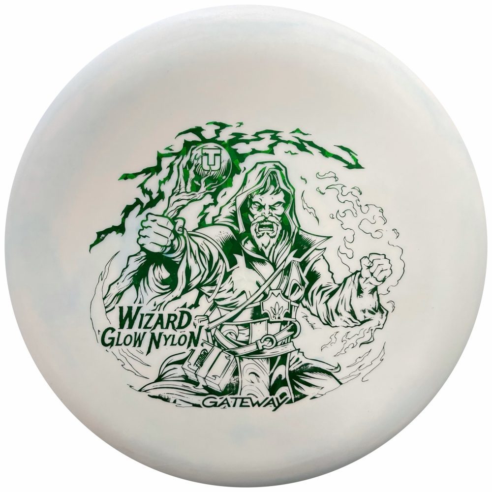The Nylon Superglow Wizard is the first release of the Nylon plastic in Superglow. The stiffness falls between SS and SSS. This run seems to be a hair shallower and faster according to Gateway. The art is by Brian Allen of Flyland Designs 2021.