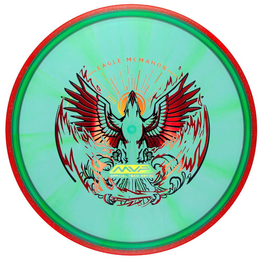 Like a phoenix rising from the ashes, Eagle McMahon’s first Official Team Series disc fully embraces the idea of new beginnings and the fire that burns within. Suitably named “Rebirth”, Mike Inscho has beautifully illustrated Eagle’s first triple-foil stamp, featuring an eagle rising from the ashes on his personal mold of choice, the Prism Proton Envy. Don’t miss your chance to snag the very first of what is sure to be a long line of discs that directly support Eagle!
