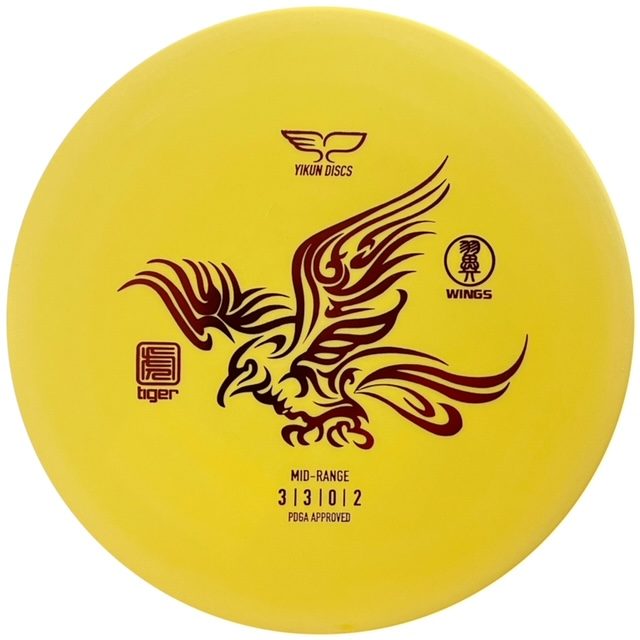 The Yikun Wings is a unique golf disc that serves as sort of a mid-range, putter hybrid. This utility wedge is designed to provide accurate upshots, without overshooting the basket. The Wings is a low cost disc available in Yikun’s inexpensive Tiger-Line plastic. For a mid-range, the Wings has a very thin profile and rim. It has a slightly overstable flight path and provides a unique throwing experience. The Wings is very similar to the Discmania Spring Ox.